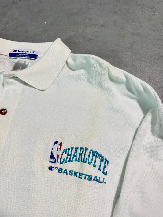 90’s Charlotte Hornets Basketball Vintage White Champion Embroidered Collared NBA Polo Shirt (XXL)