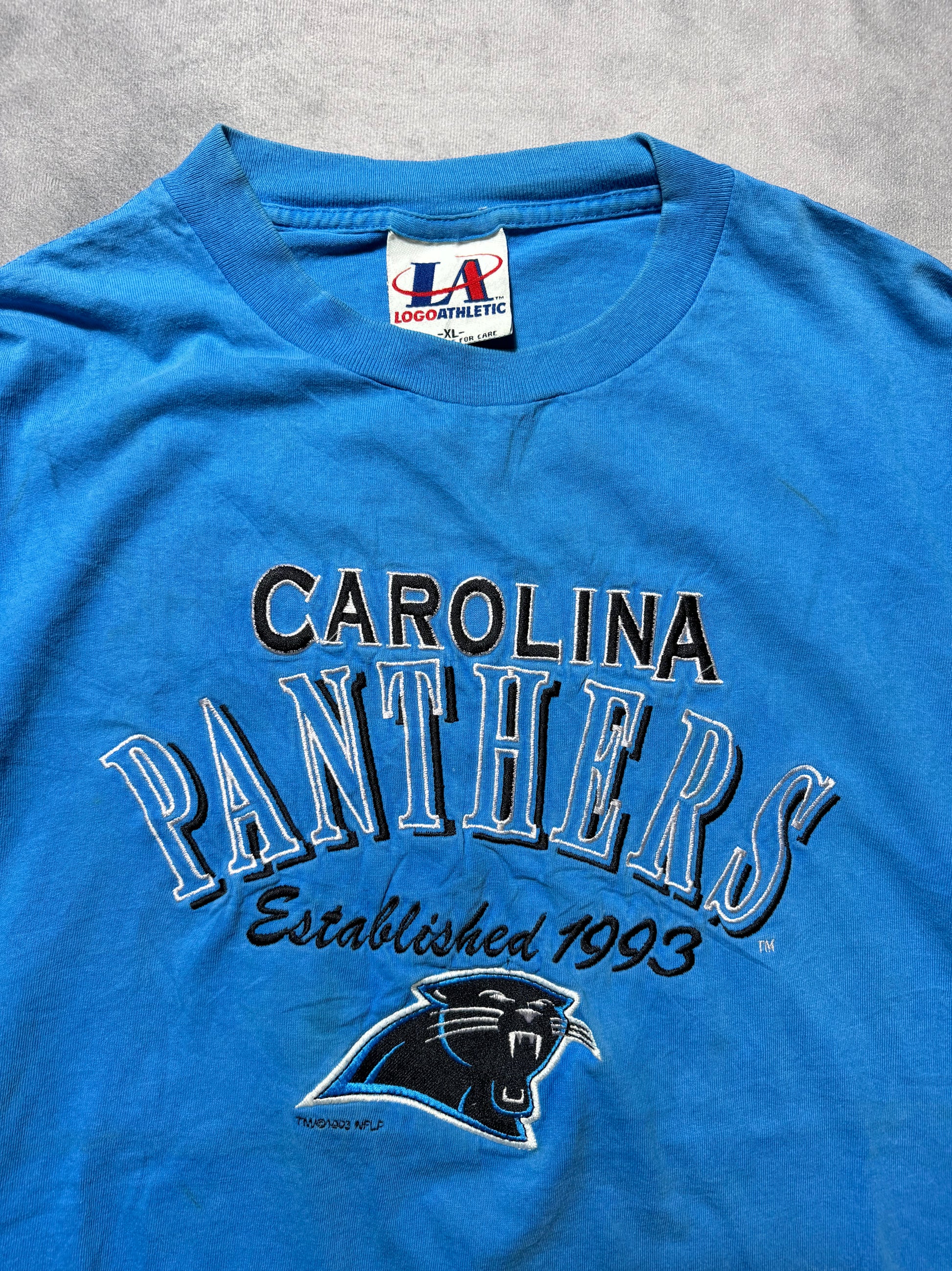 1993 Carolina Panthers Vintage Blue Logo Athletic Embroidered Spellout NFL Tee (XL)