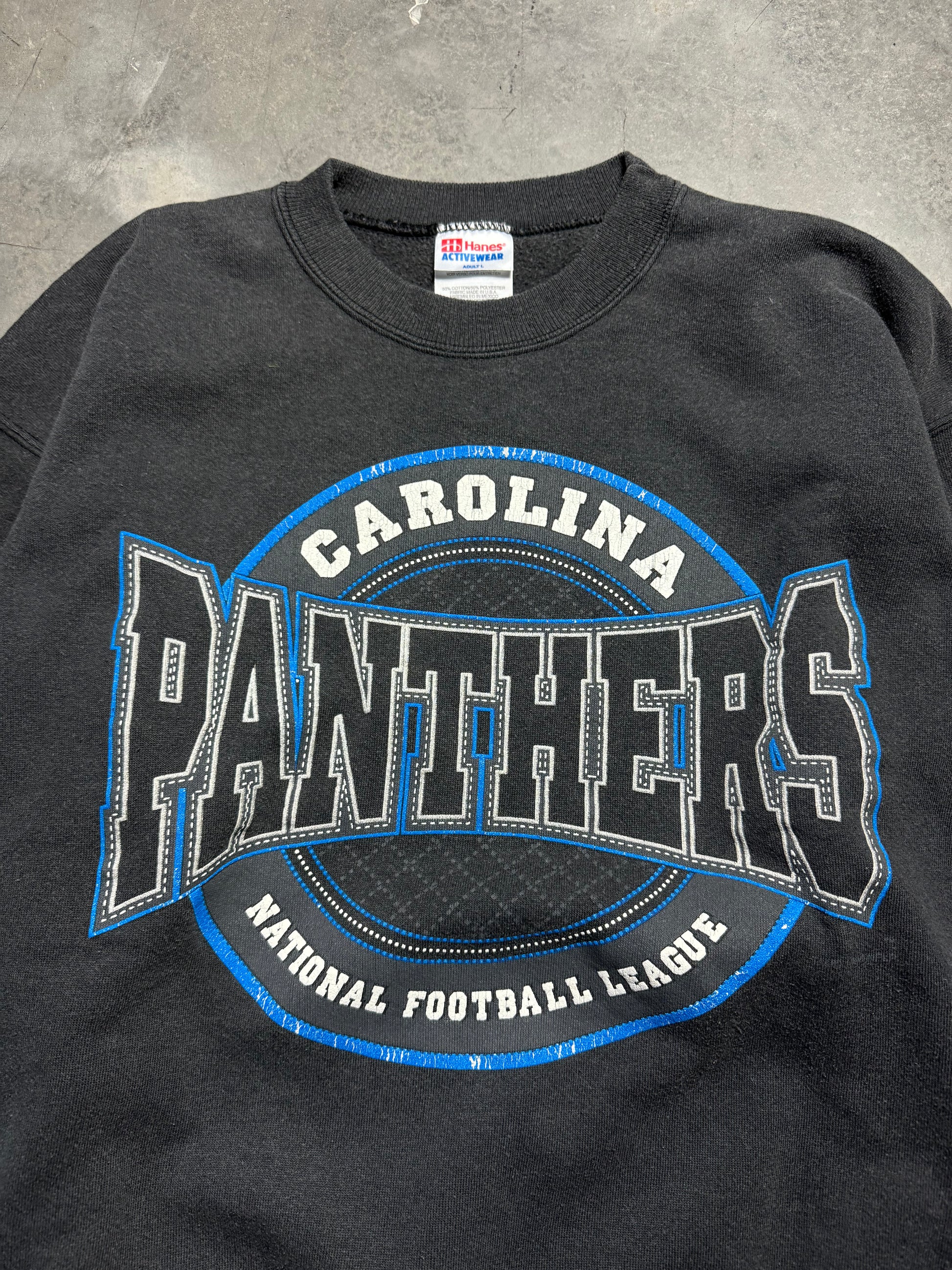 1996 Carolina Panthers Vintage Faded Black Sphere Spellout Logo NFL Crewneck (Large)