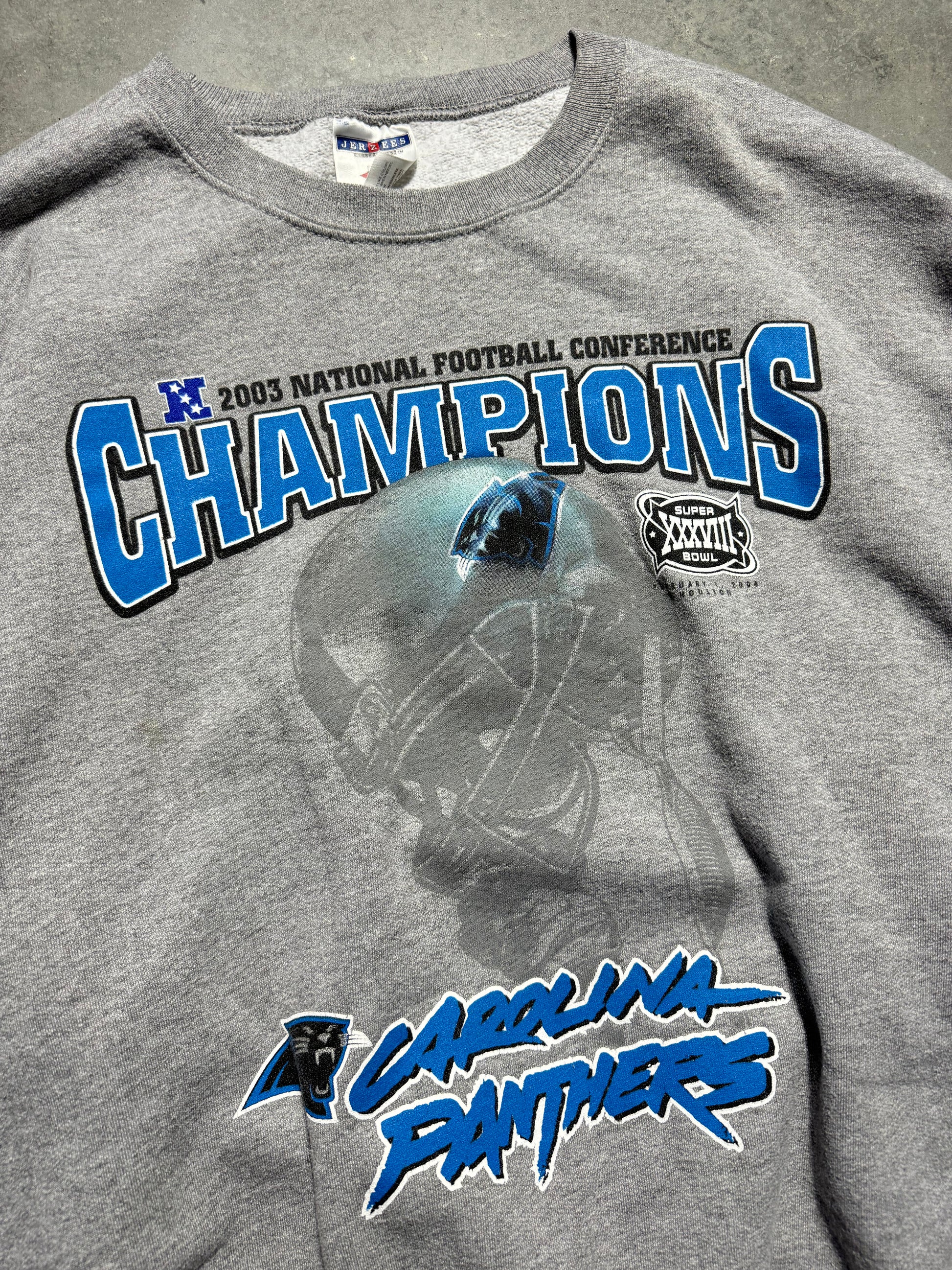 2003 Carolina Panthers NFC Champions Super Bowl XXXVIII Cat Scratch Font Logo NFL Crewneck (Boxy XL)
