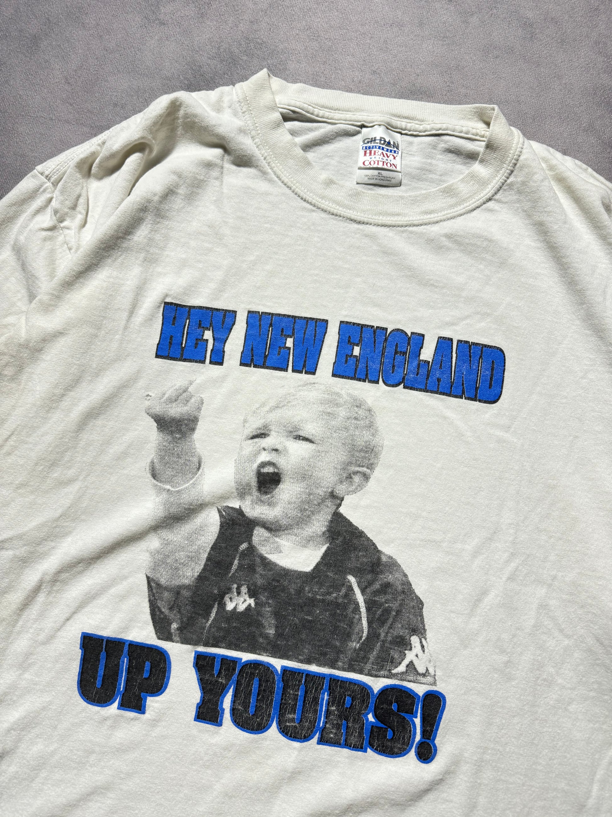 2004 Carolina Panthers vs. New England Patriots Super Bowl XXXVIII “Hey, New England Up Yours!” Vintage White Parking Lot NFL Tee (XL)