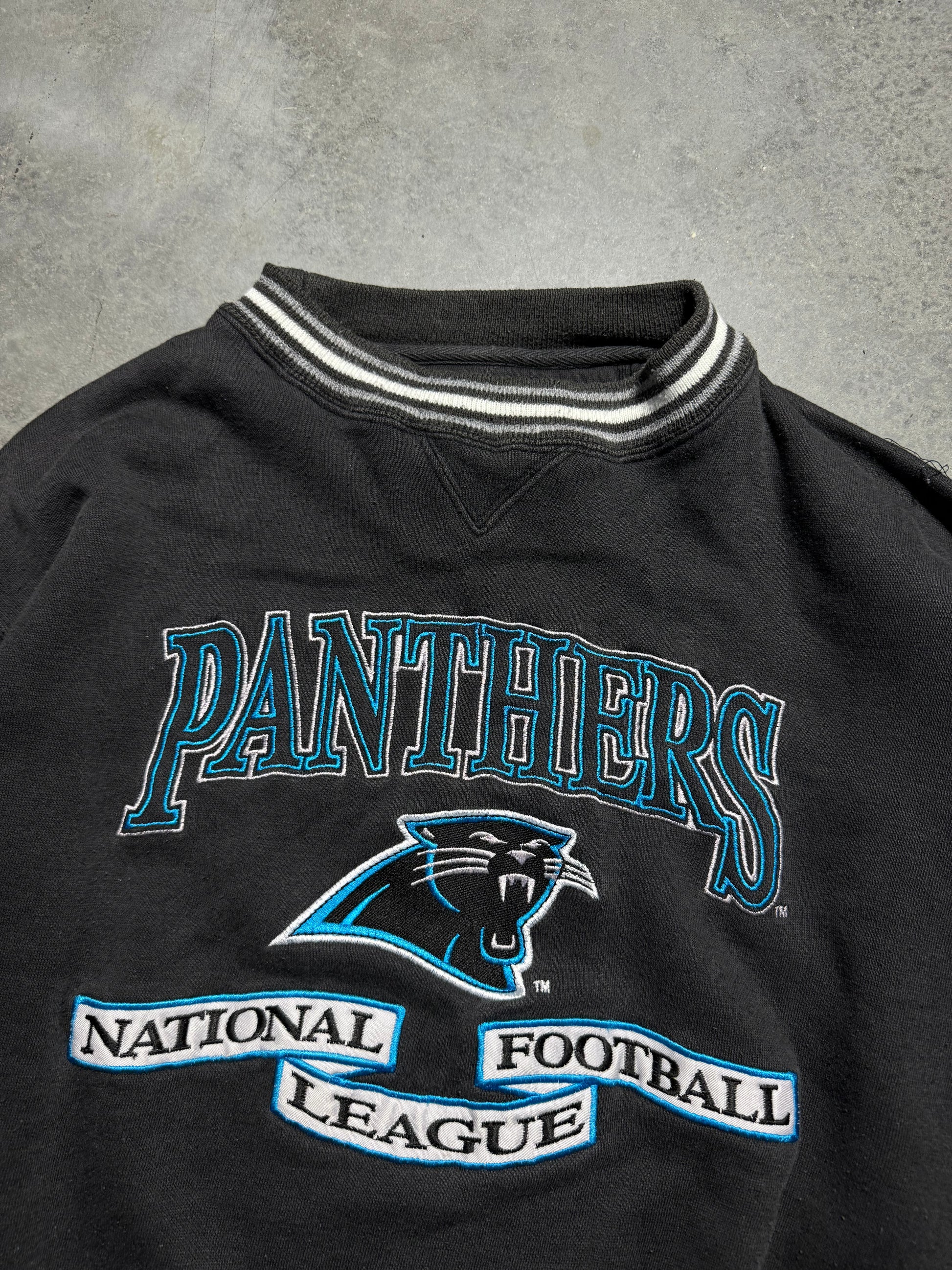 90’s Carolina Panthers Vintage Black Logo Athletic Embroidered Ribbed NFL Crewneck (Large)