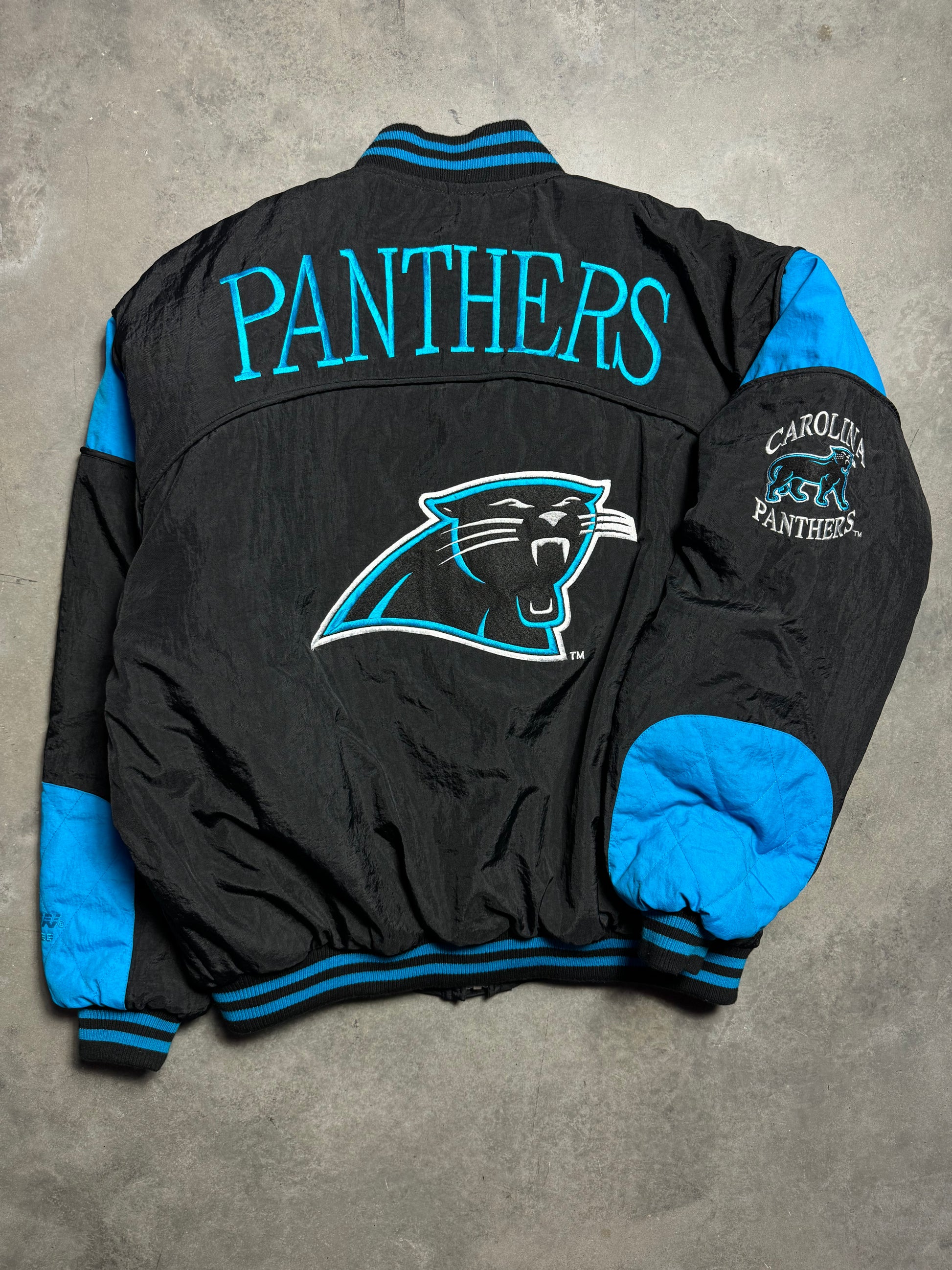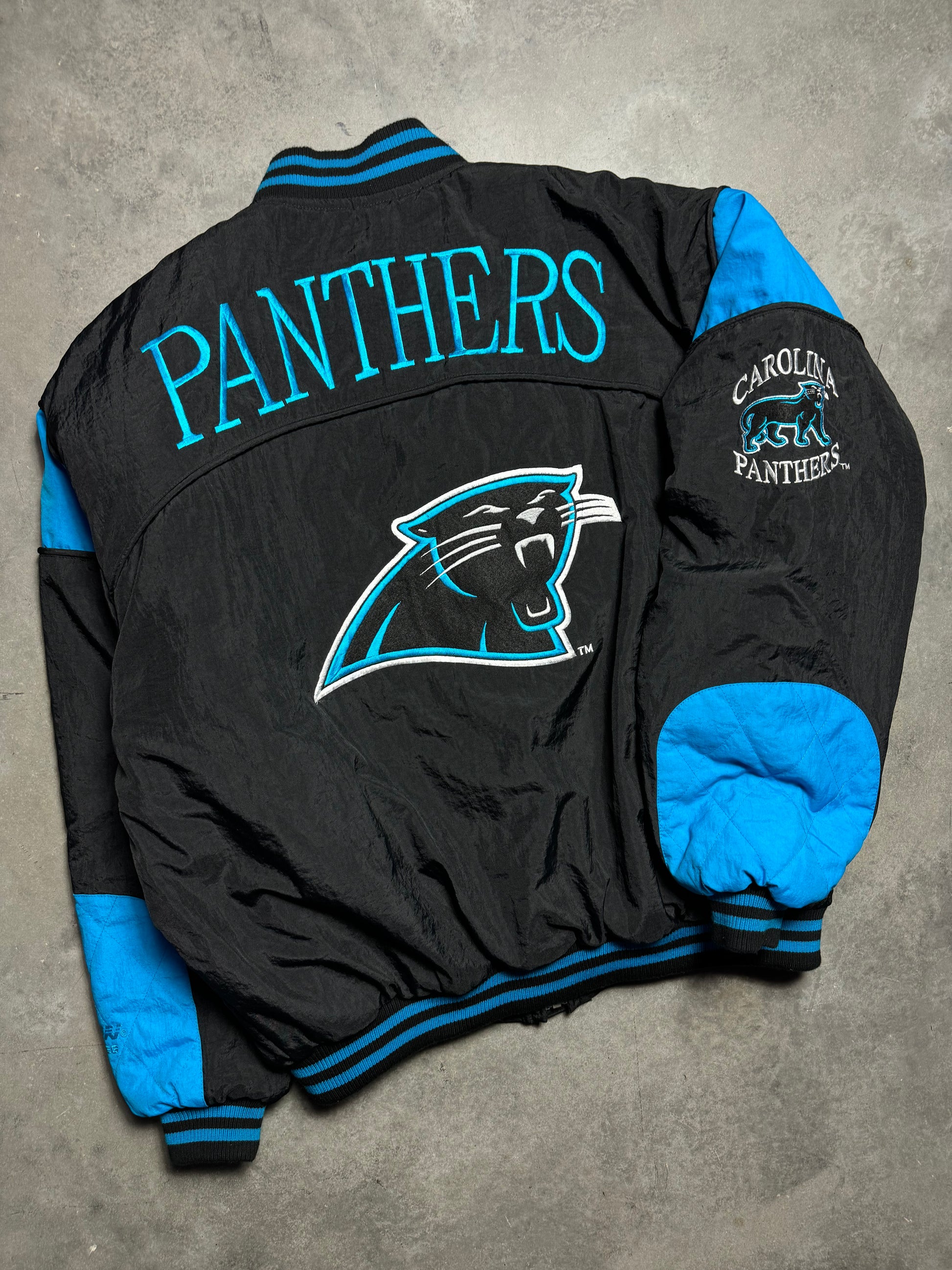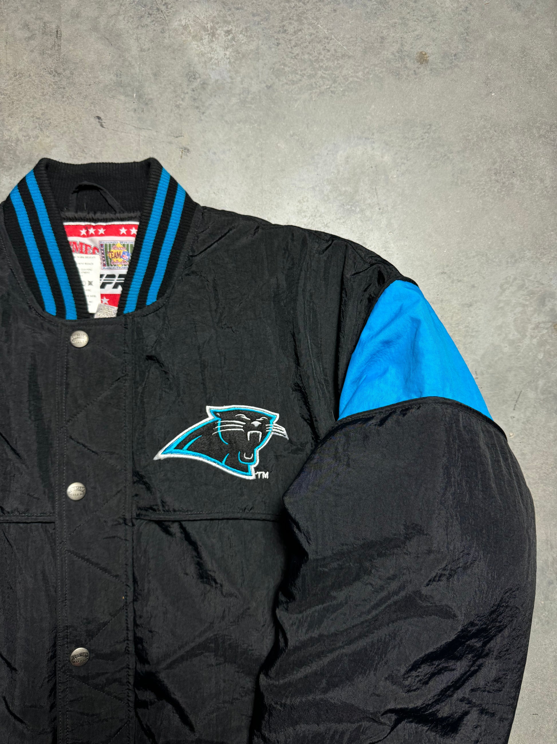 90’s Carolina Panthers Vintage Black Nutmeg Mills Campri Full Cat Alternate Logo NFL Quilted Bomber Nylon Jacket (XL)