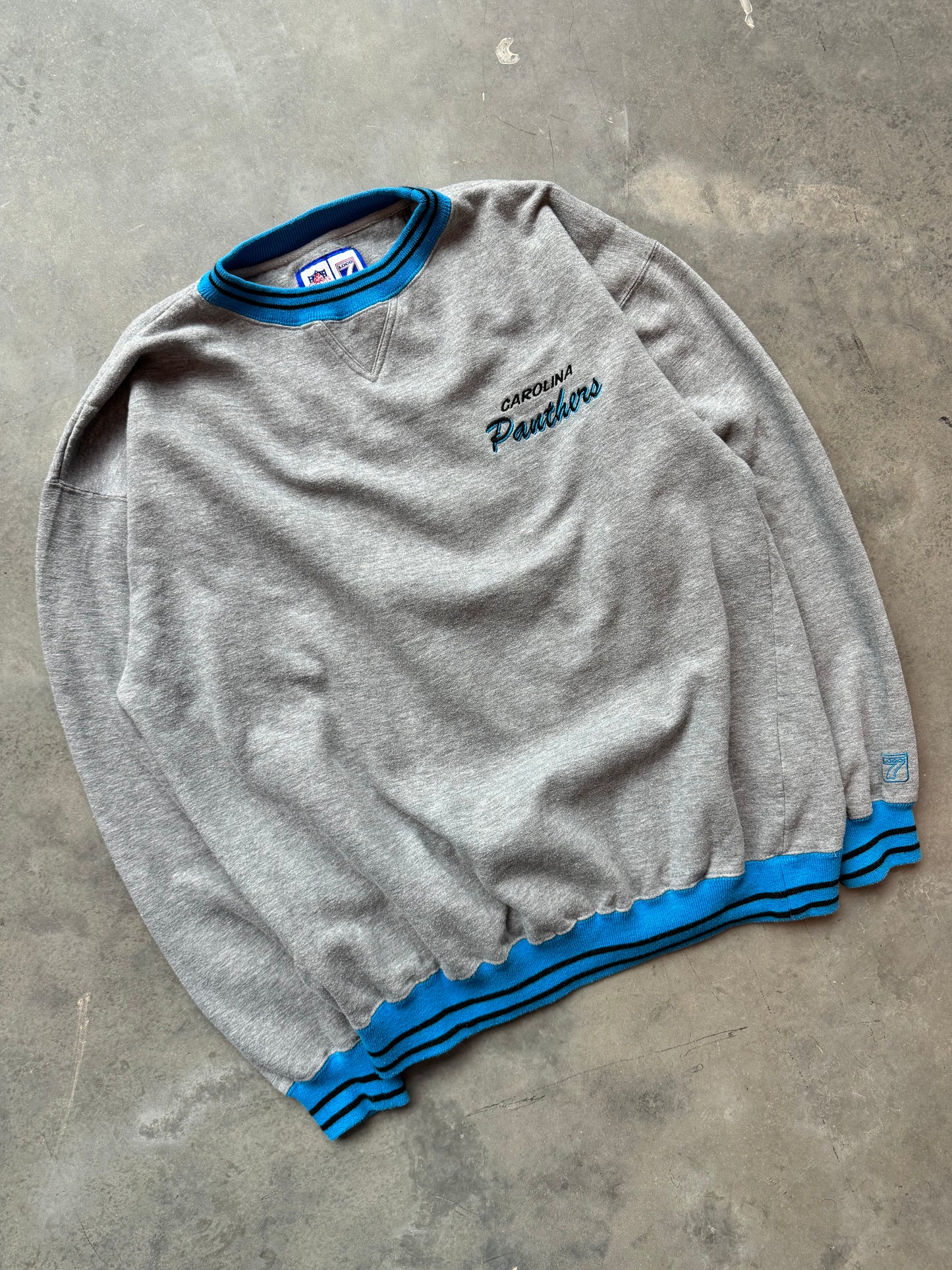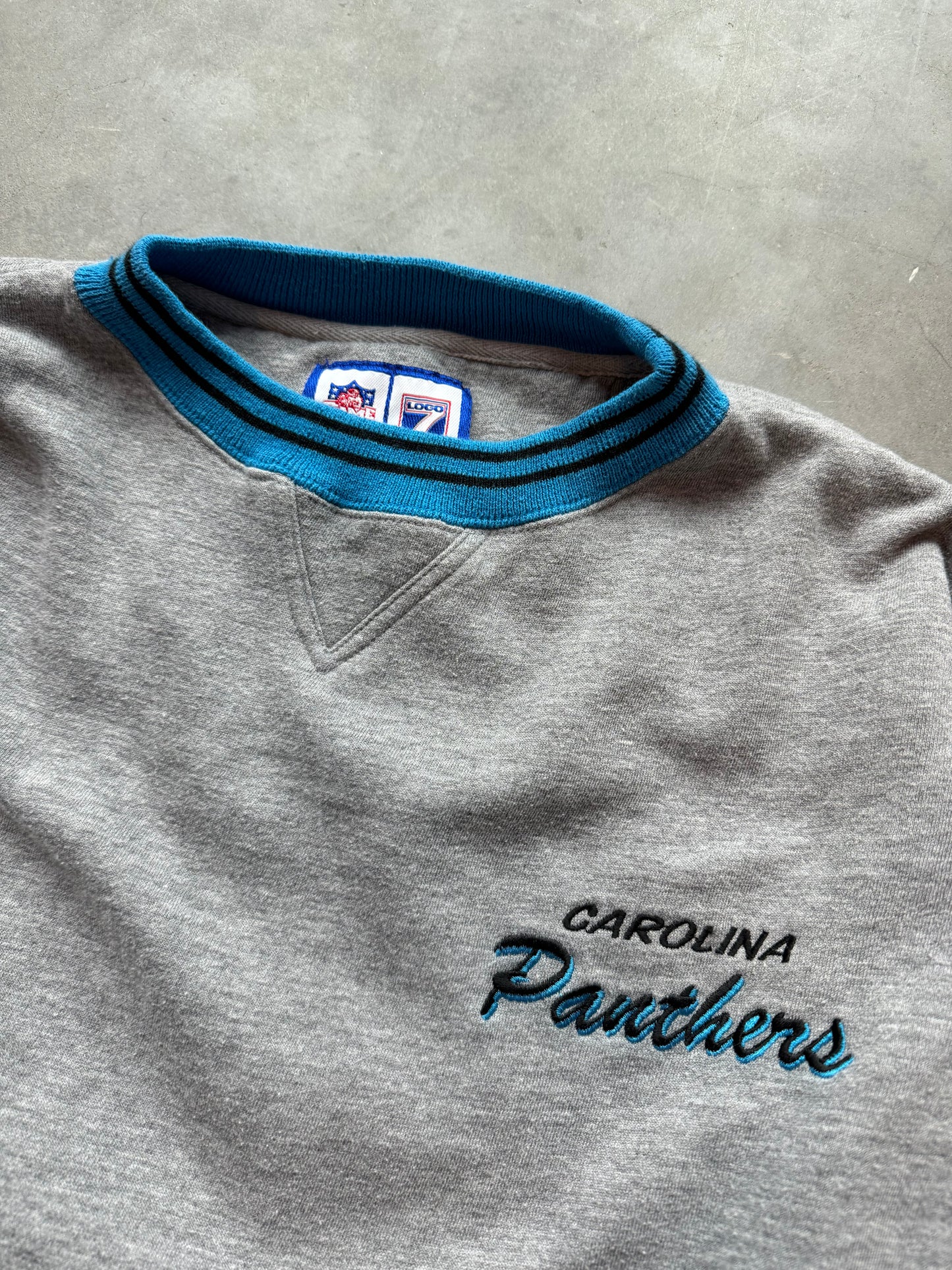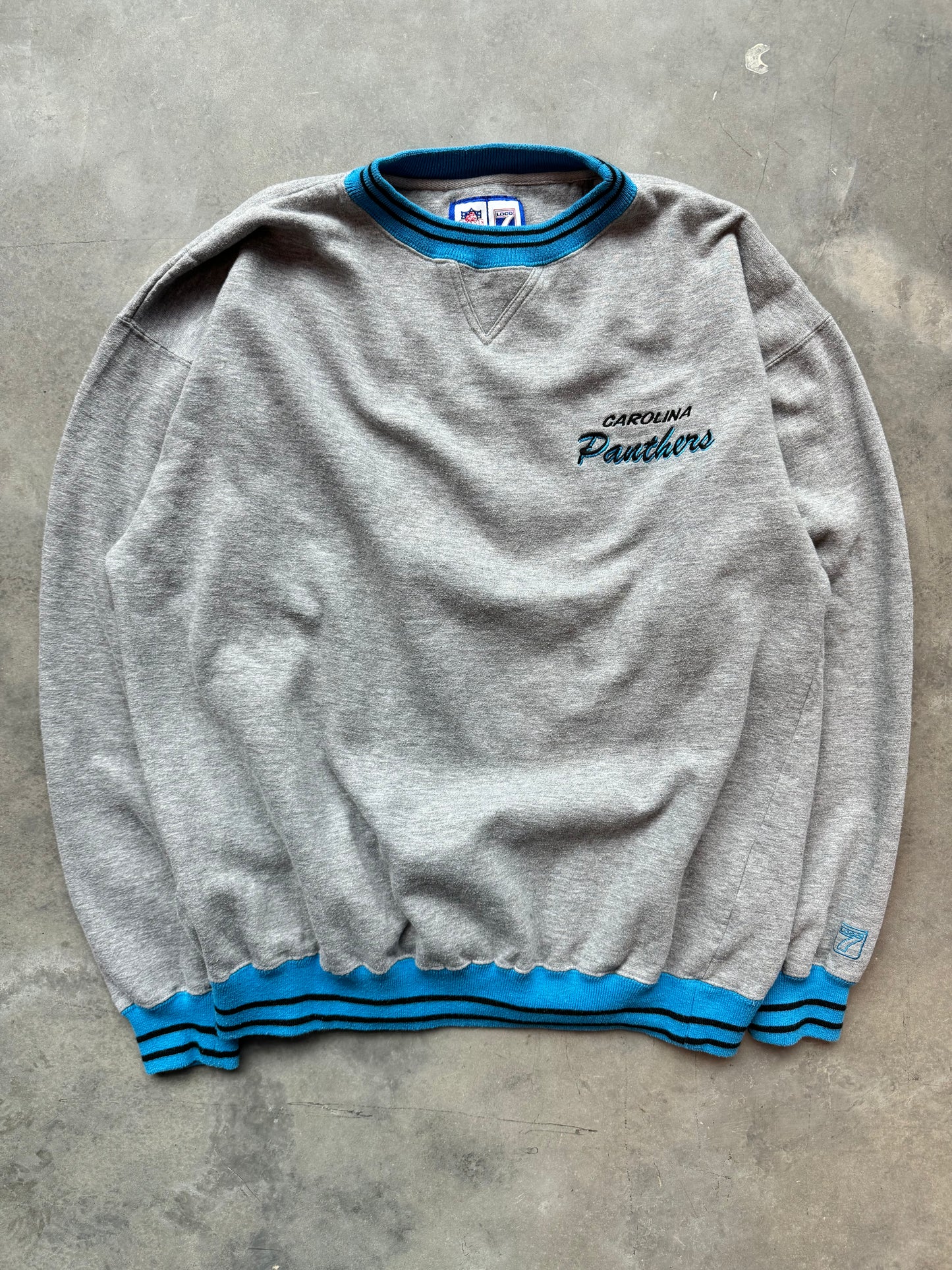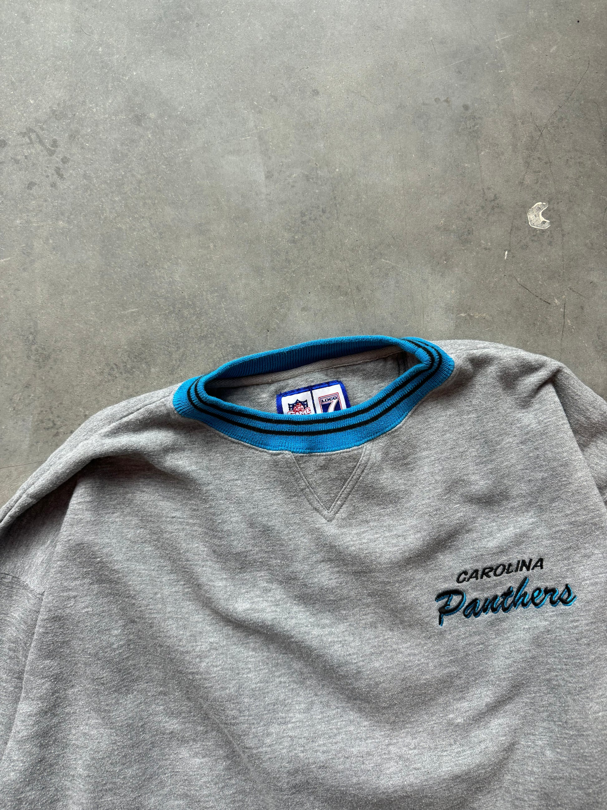 90’s Carolina Panthers Vintage Grey Logo 7 Ribbed NFL Embroidered Crewneck (Large)