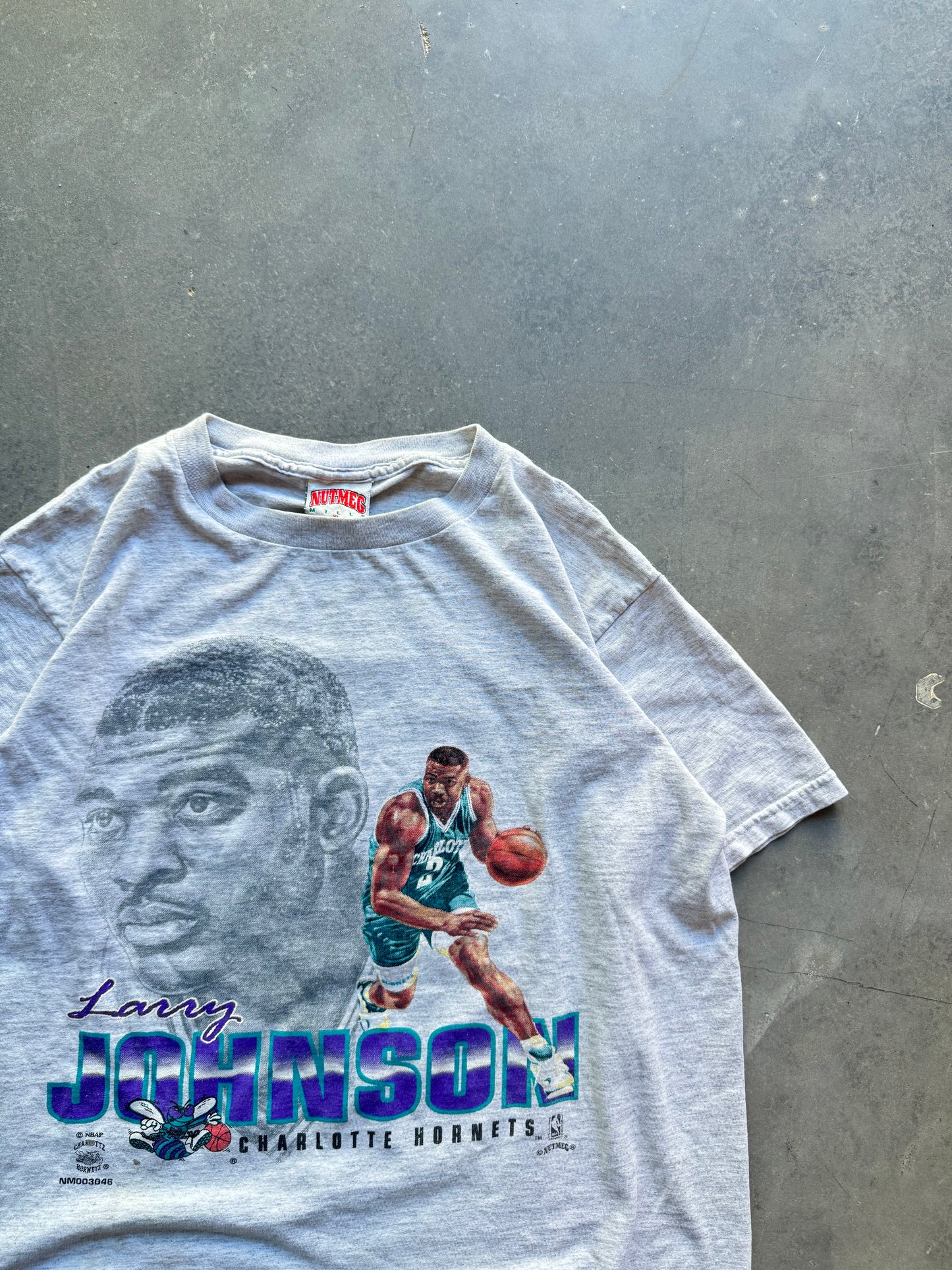 90’s Charlotte Hornets Larry Johnson Vintage Nutmeg Mills Big Face Player Tee (Youth XL)