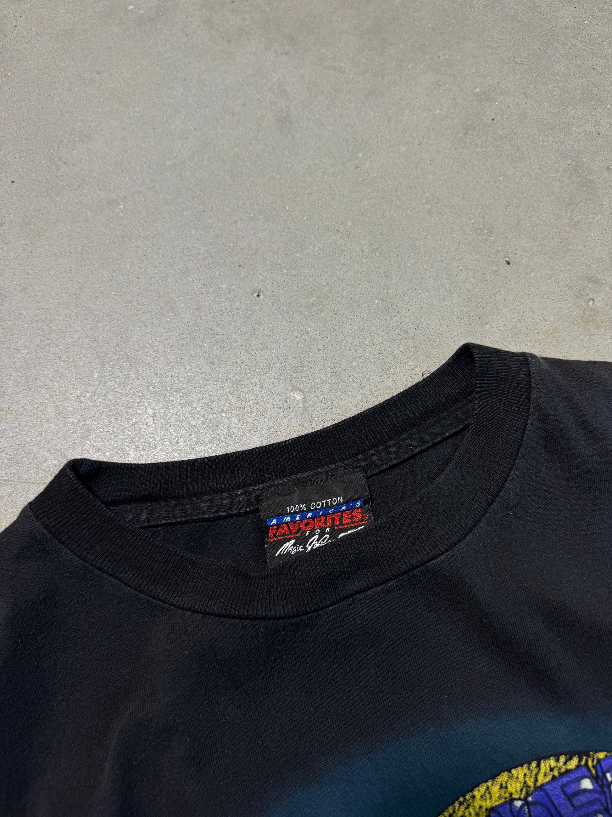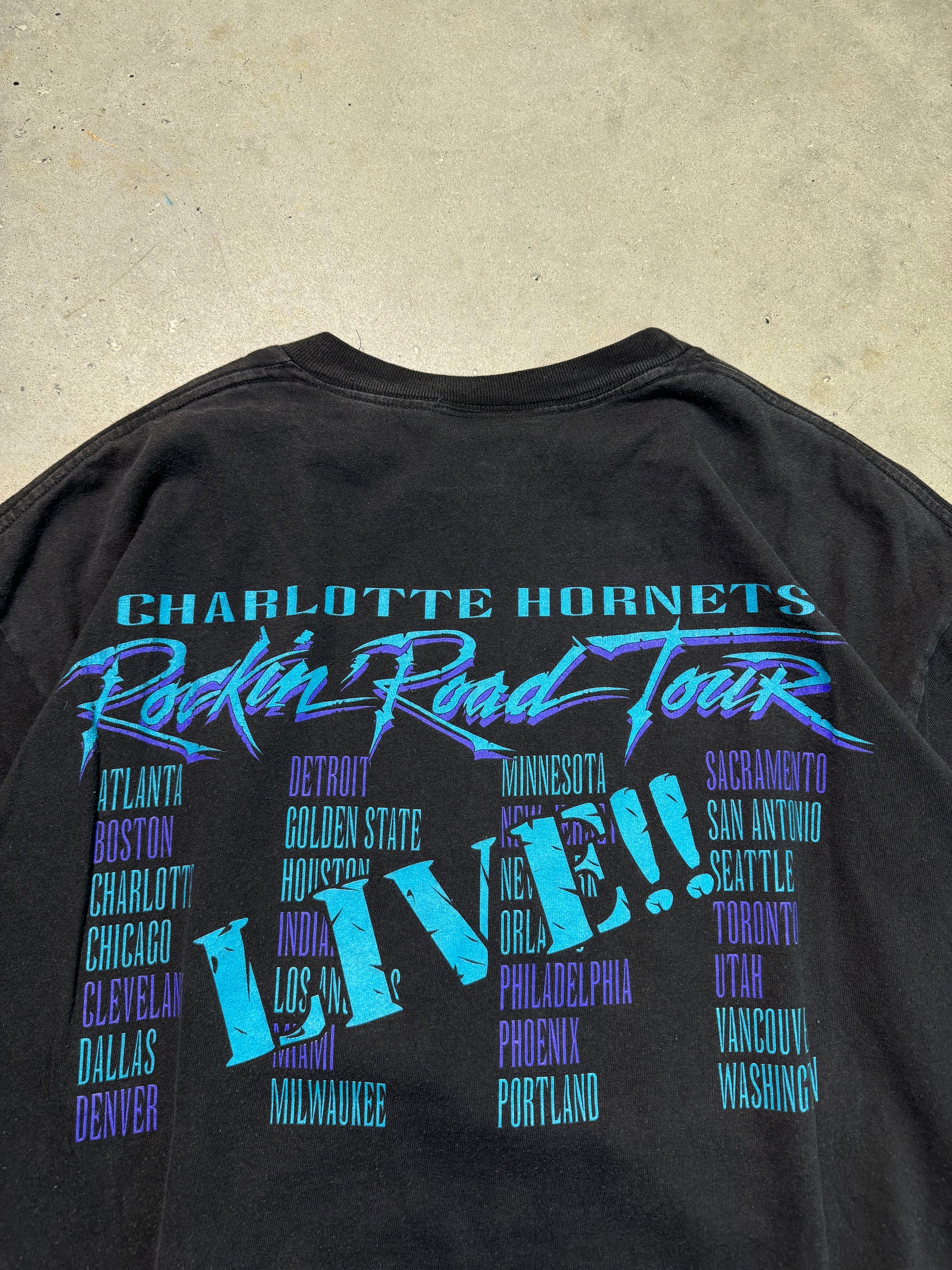 90’s Charlotte Hornets Vintage Black “Rockin’ Road Tour” Prince Purple Reign Inspired NBA Tee (XL)