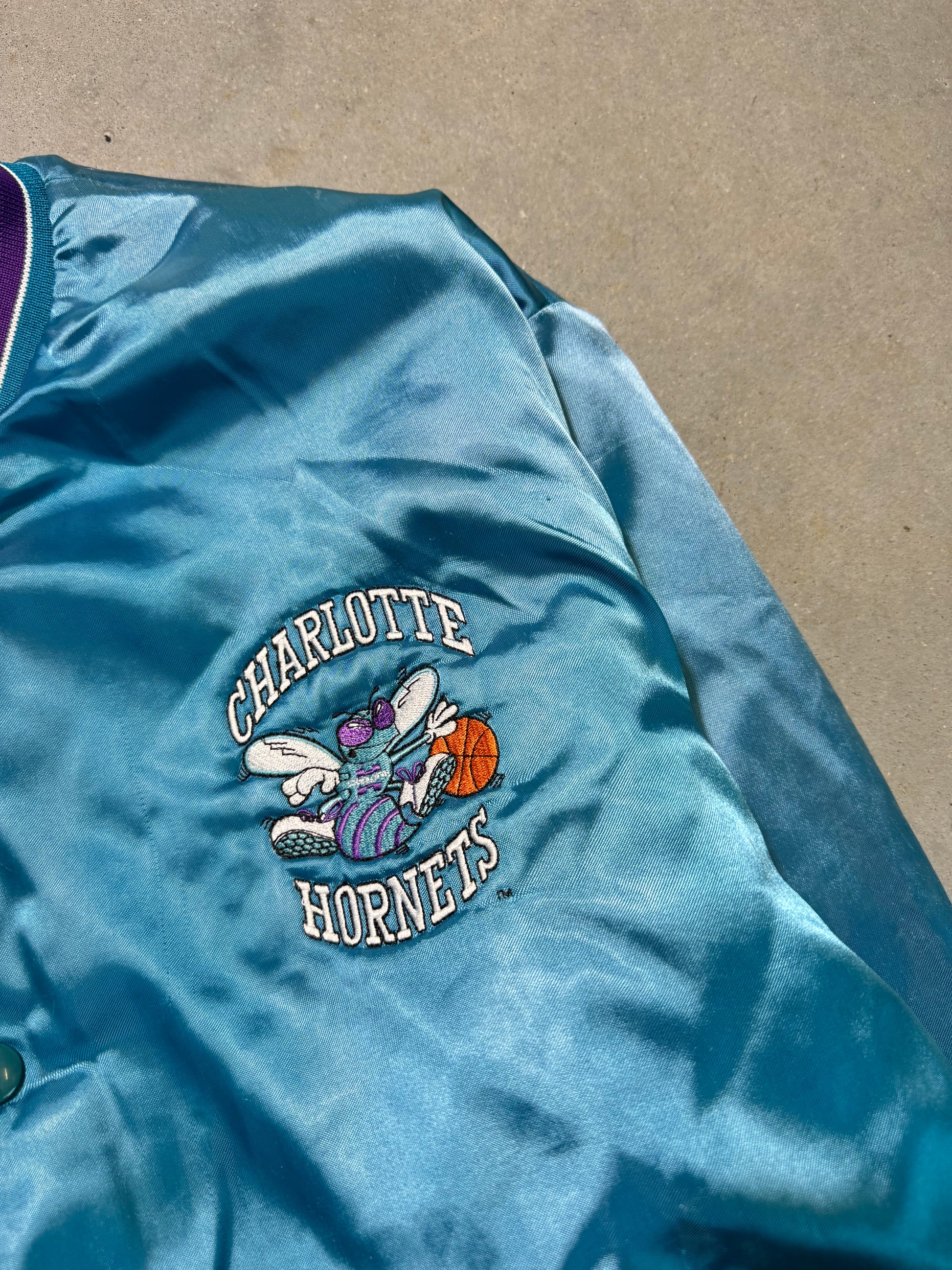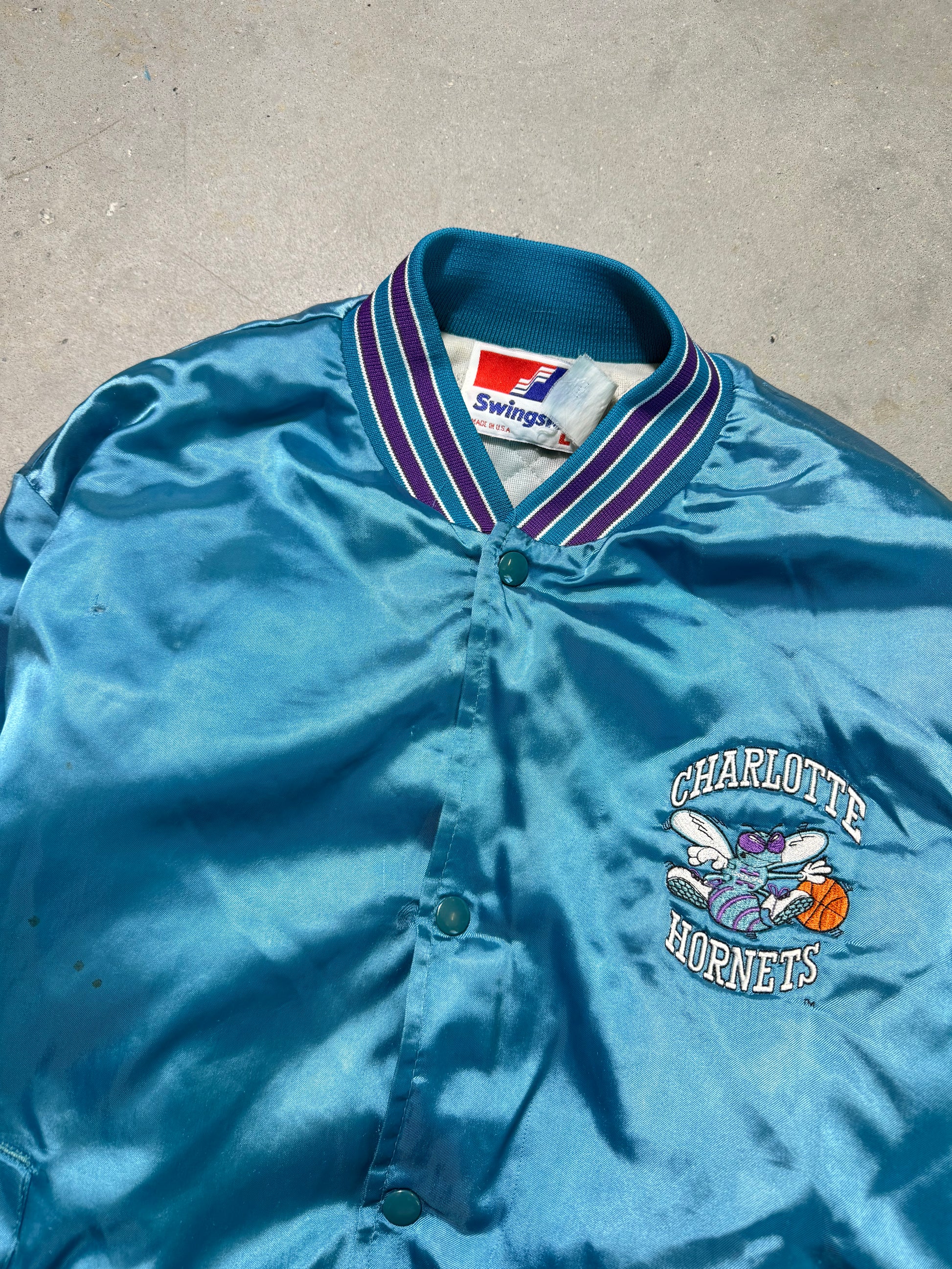 90’s Charlotte Hornets Vintage Distressed Teal Swingster NBA Satin Jacket (Large)