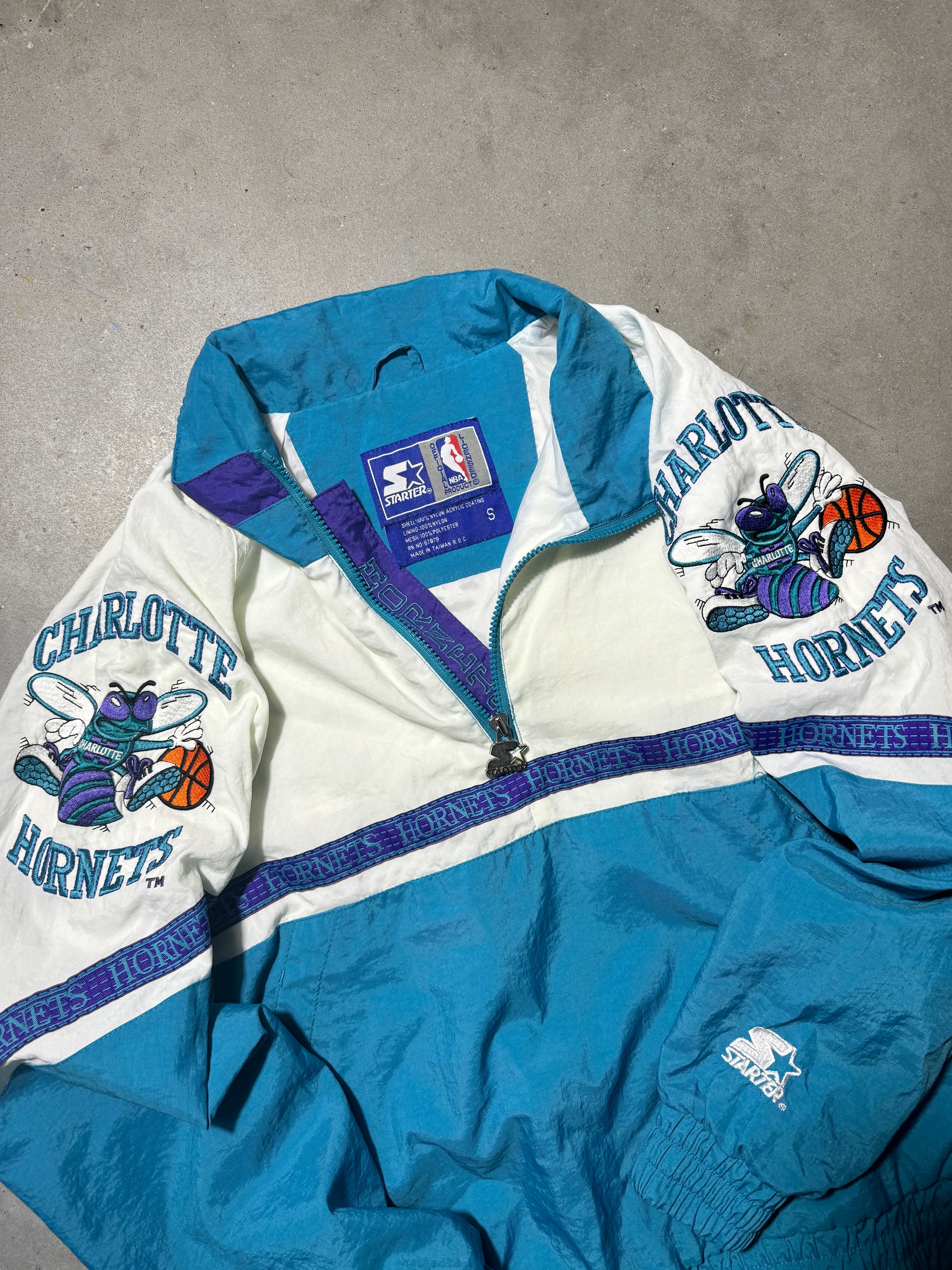 90’s Charlotte Hornets Vintage White Teal Starter Big Logos Half Zip NBA Pullover Jacket (Small)